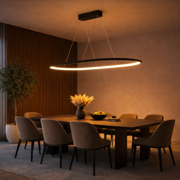 Elegancja, nowoczesność i funkcjonalność – Nowoczesna lampa wisząca Led Ellipse No.1 120 cm czarna barwa ciepła to designerskie oświetlenie, które doskonale komponuje się z nowoczesnymi wnętrzami. Jej eliptyczny kształt, inspirowany współczesną architekturą, sprawia, że lampa staje się zarówno funkcjonalnym, jak i dekoracyjnym elementem przestrzeni. Czarne matowe wykończenie idealnie wpisuje się w stylistykę industrialną, skandynawską i minimalistyczną, podkreślając nowoczesny charakter wnętrza.