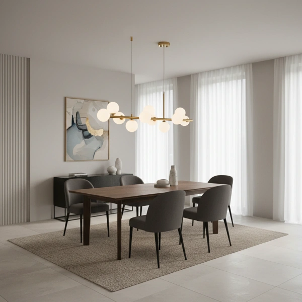 Lampa wisząca Lunaris 11 to rozwiązanie, które idealnie sprawdzi się w różnych aranżacjach wnętrz. W salonie stworzy efektowną centralną dekorację, a w jadalni perfekcyjnie podkreśli strefę stołu, zapewniając odpowiednie oświetlenie podczas wspólnych posiłków. Dzięki swojej konstrukcji lampa może być także montowana w przestronnych pomieszczeniach, co czyni ją świetnym wyborem do większych przestrzeni o wysokich sufitach.
